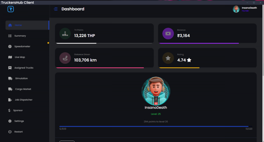 TruckersHub Tracker Update V1.2.0 Updated User Interface of the Client. Added Security for local Tracker Files to be manipulated. Custom Cargo Mods to be displayed in Job Dispatcher. Added over speeding warning beep. Added max speed warning beep. Added security in the Client. Fixed issue with game overlay bieng stuck when "Alt + tabbed". Added Client Overlay in Game by pressing "Ctrl + T" Added TruckersHub Blog Posts on the Home page. Added TruckersHub Important Links. Added Notification for TruckersHub updates / announcements. Categorised side bar. Updated User Dashboard with some additional informations. Updated Dispatcher with fixed major Glitches. Fixed Icons showing in the client. Added new features options in settings page. Fixed Issue of Tracker not taking job from specific cities. Major Bugs Fixes.2 points
